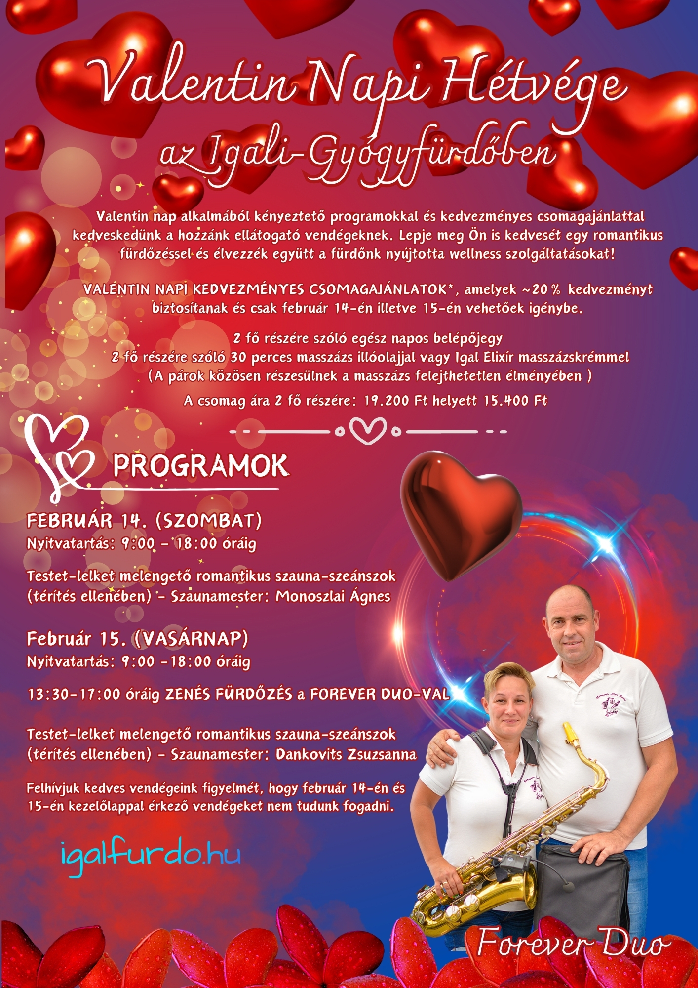 A valentin napi csomag kizárólag személyesen, 2026. február 14-én és 15-én a fürdő pénztárában vásárolható!