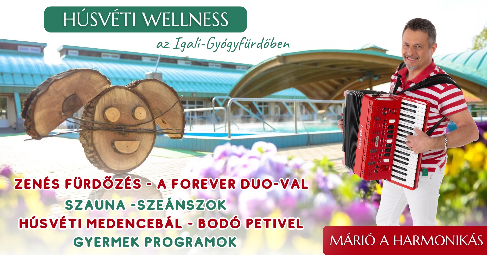 Töltődjön fel húsvétkor is az Igali-Gyógyfürdőben. A húsvéti ünnepek alkalmából zenés fürdőzéssel, sztárvendéggel (Márió a harmonikás ), vidám gyermekprogramokkal, családi tojásvadászattal várjuk kedves vendégeinket.