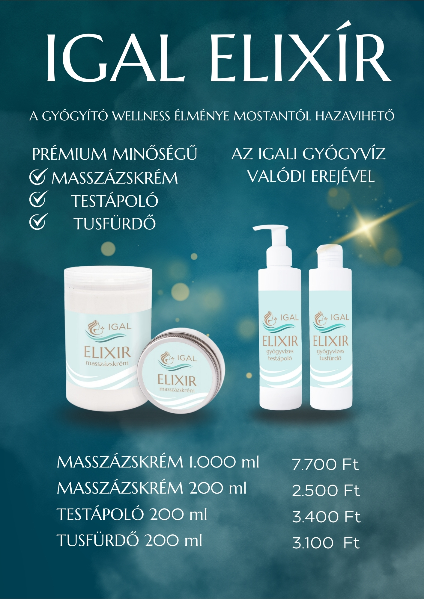 A teljes IGAL ELIXÍR termékcsaládot egyelőre csak személyesen, a fürdő recepcióján lehet megvásárolni.