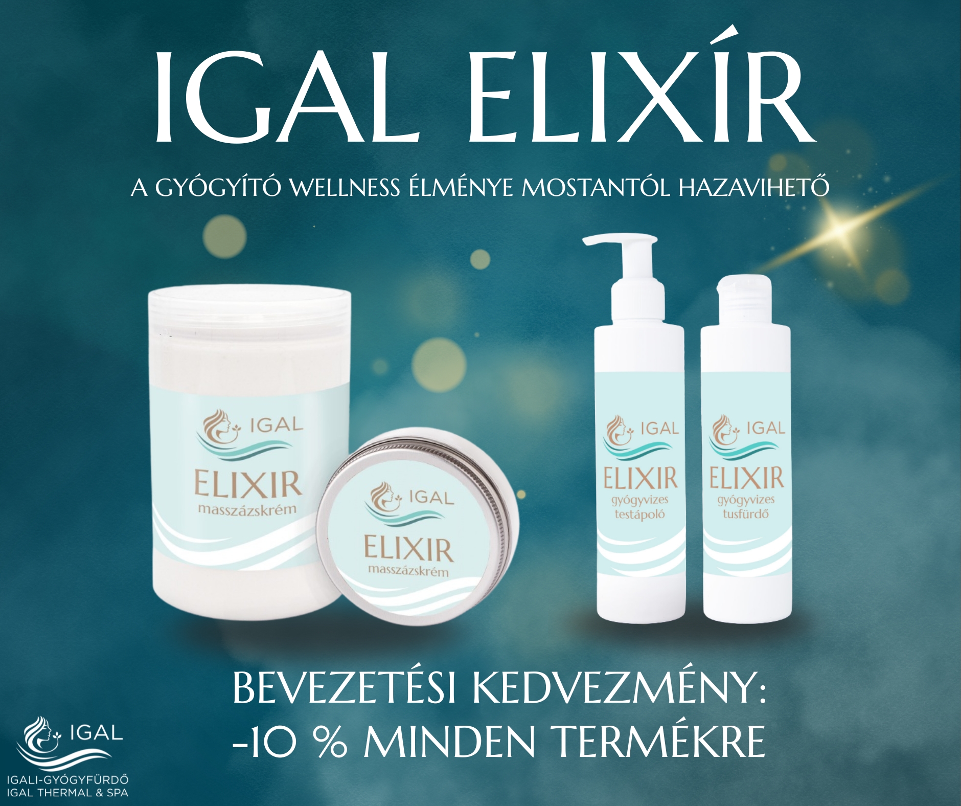 A teljes IGAL ELIXÍR termékcsaládot 10% kedvezménnyel vásárolhatjátok meg a bevezetési időszakban – egyelőre csak személyesen, a fürdő recepcióján.